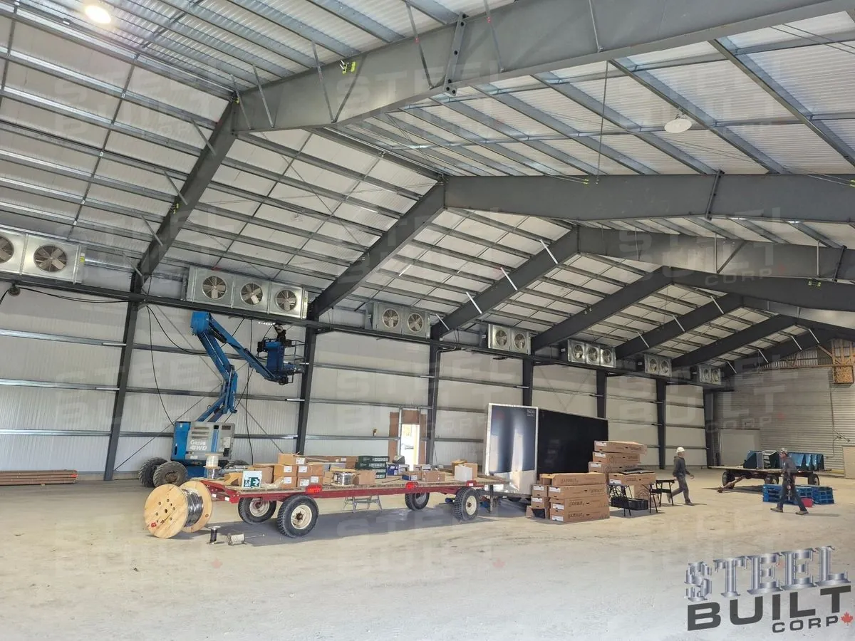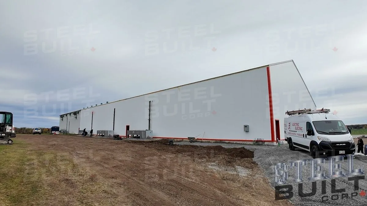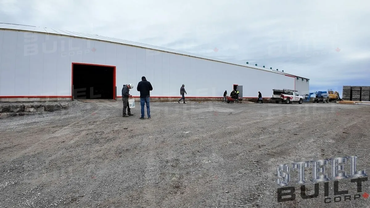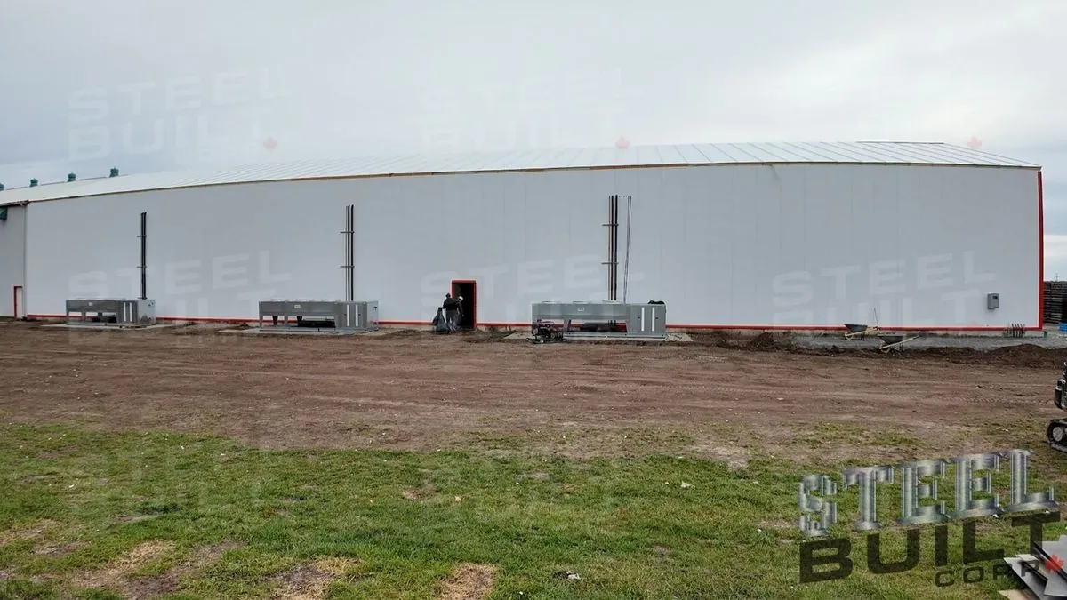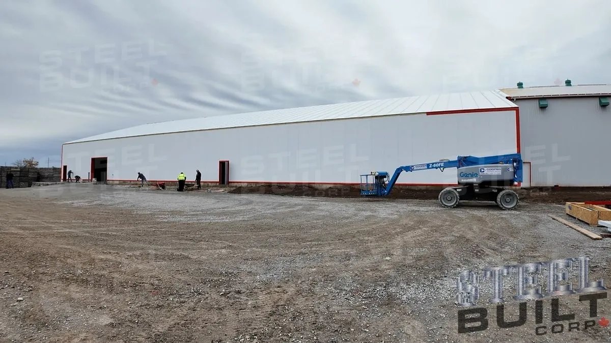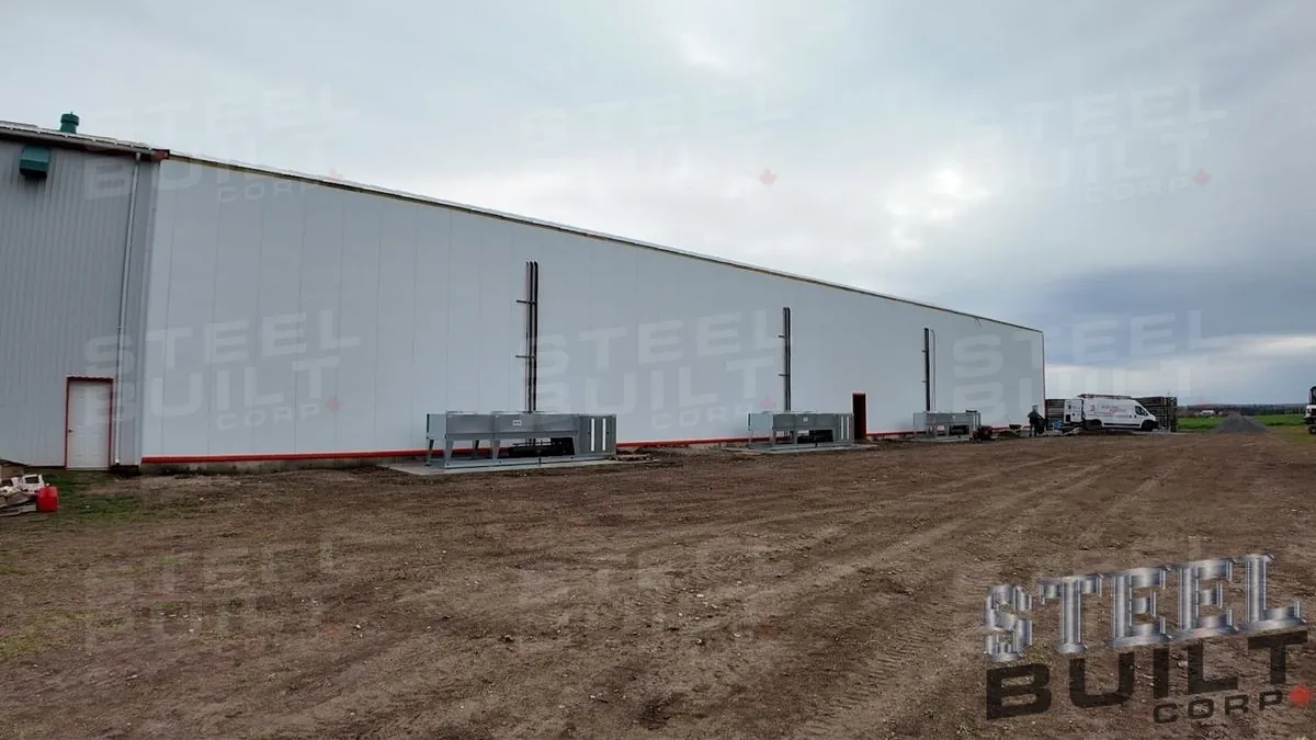 Completed80x180x12/14 Agricultural Building in Woodville, Ontario, featuring a farm building addition made with insulated metal panels.