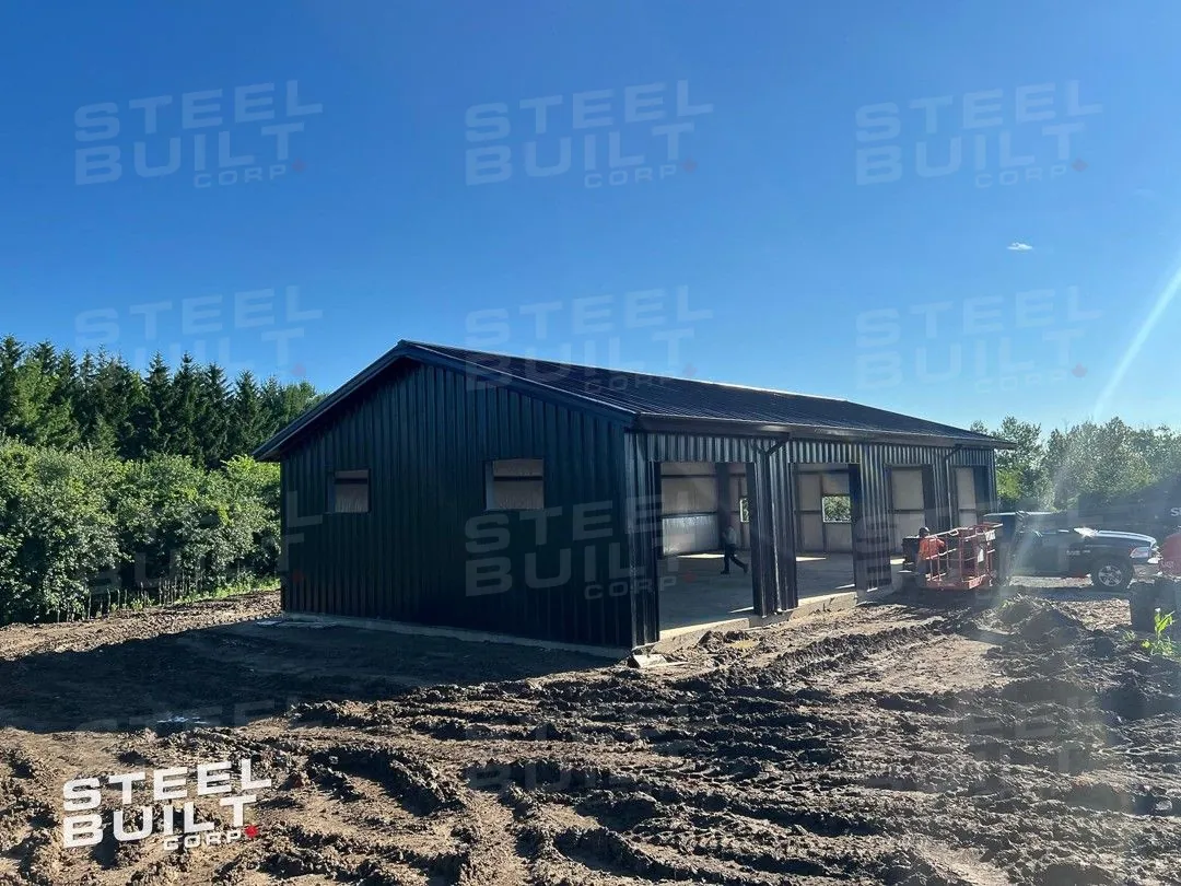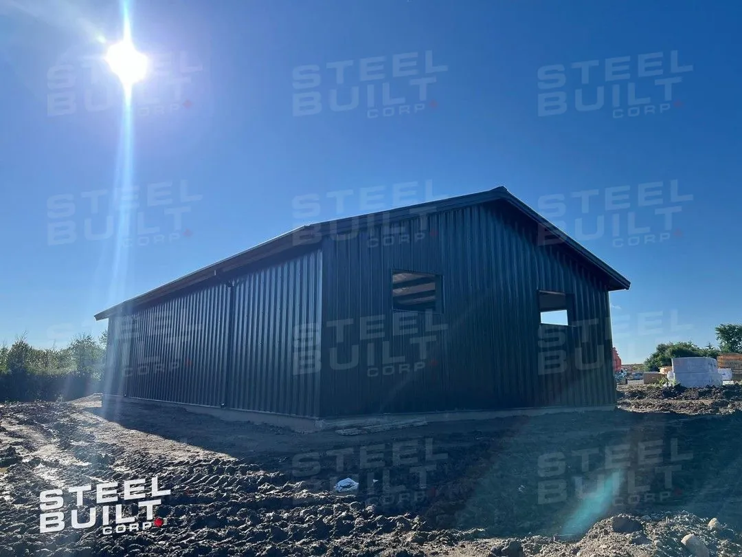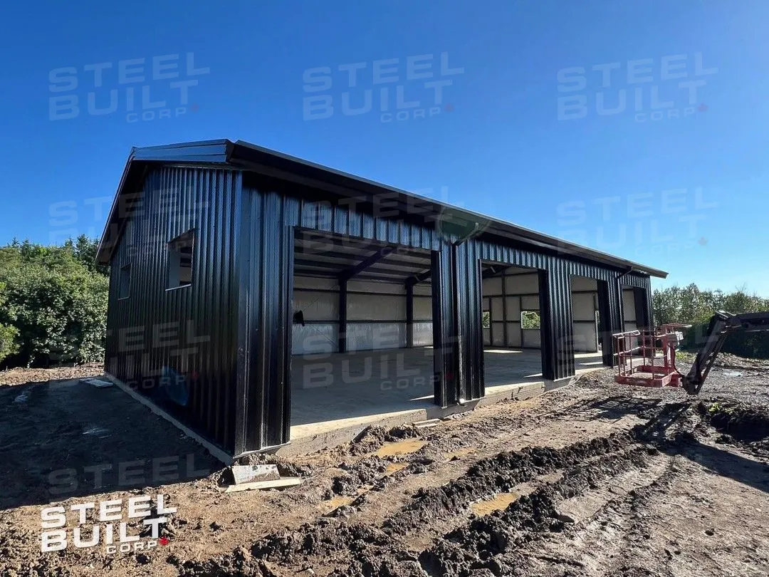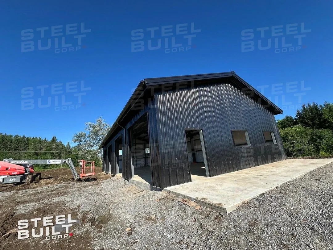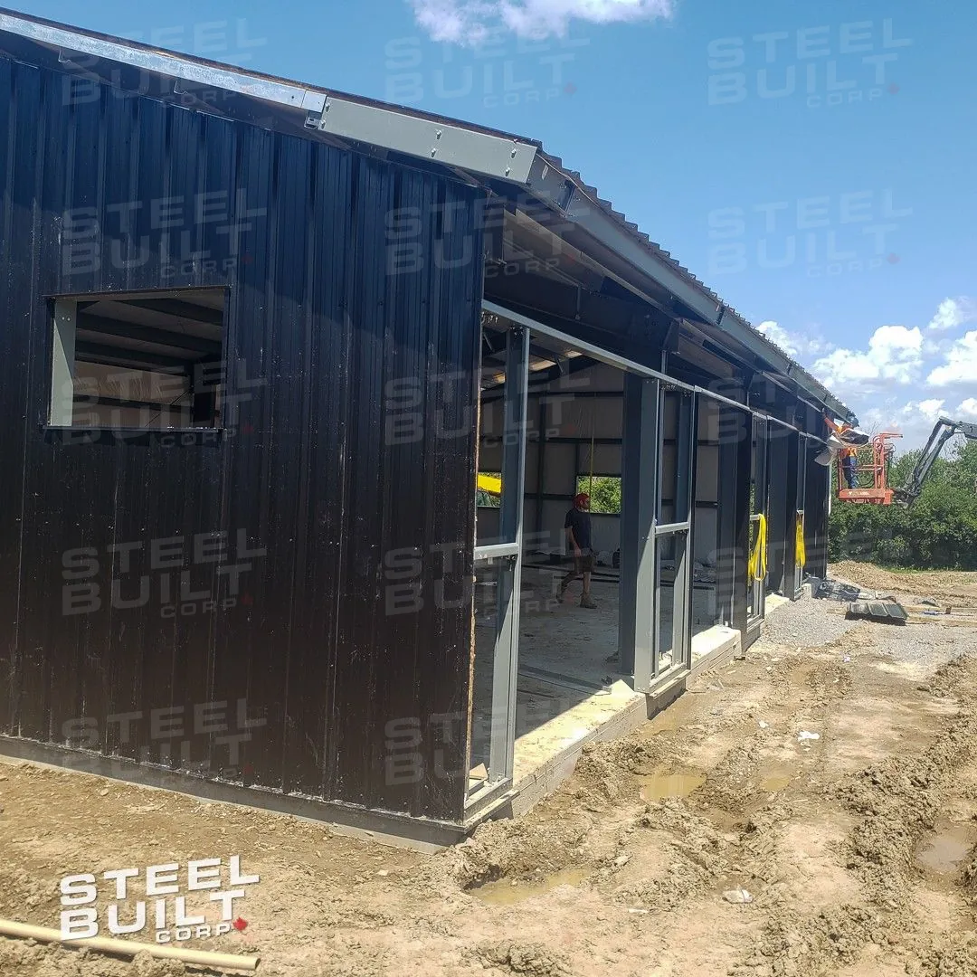 CompletedA 35x65x13 steel garage in Uxbridge, Ontario, with multiple overhead doors for vehicle access and storage, finished in black on black steel.
