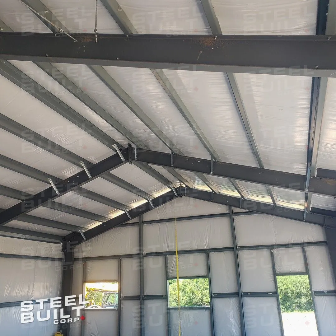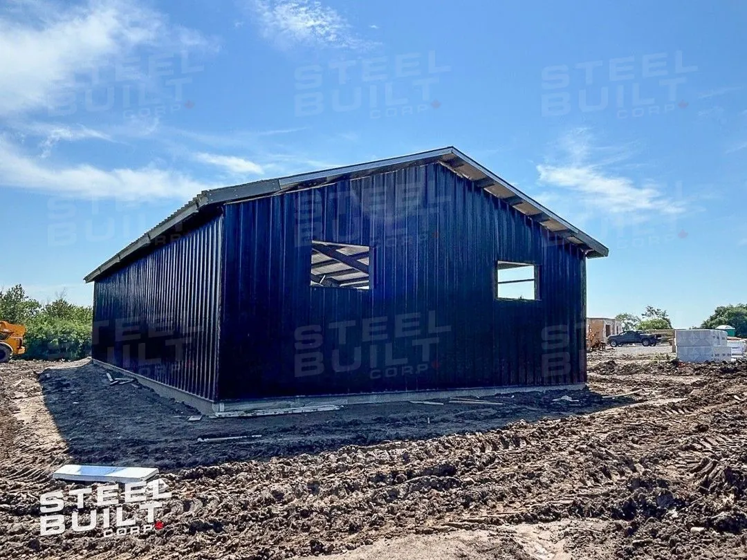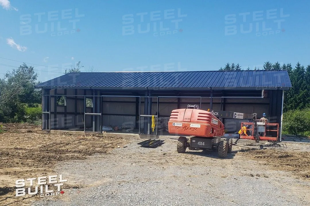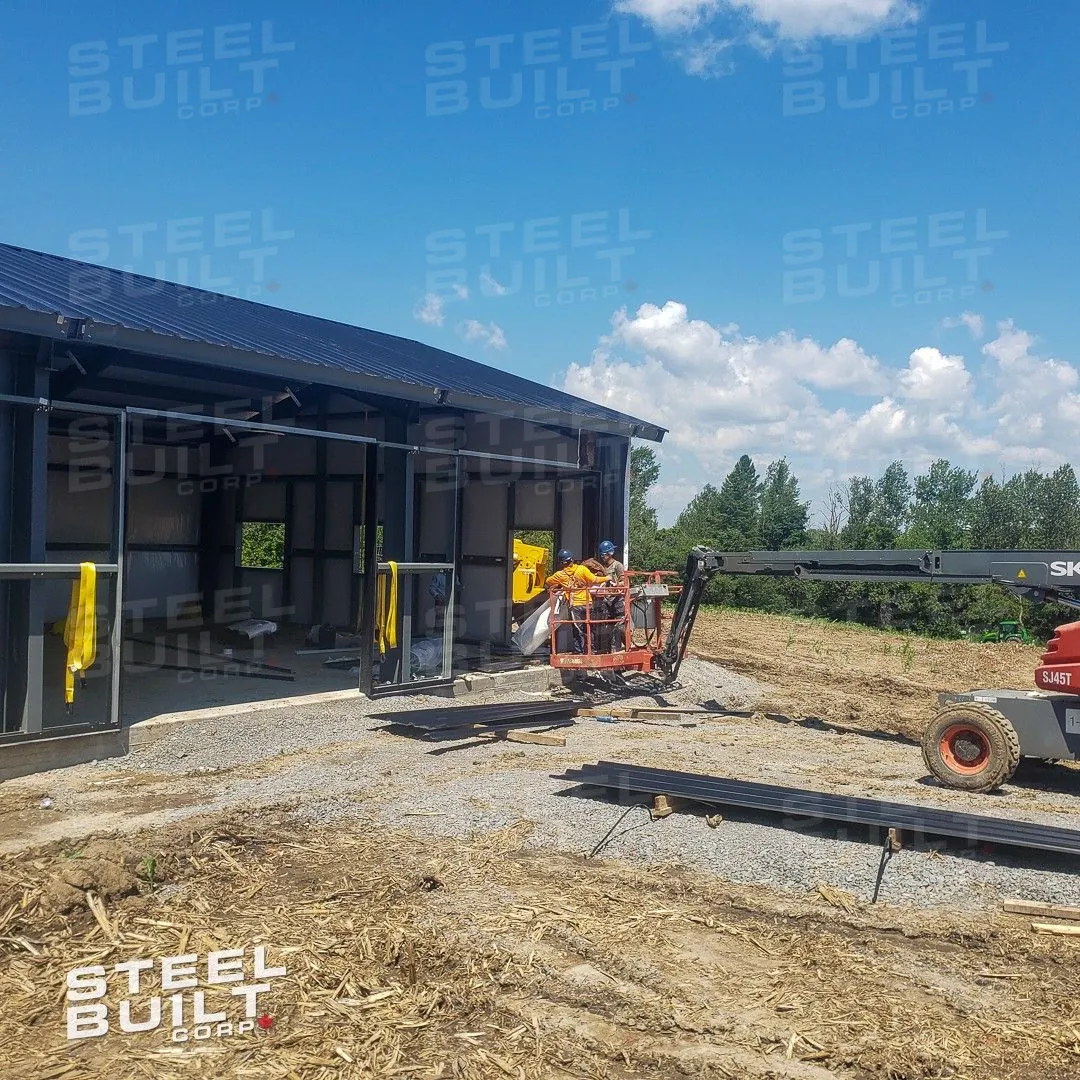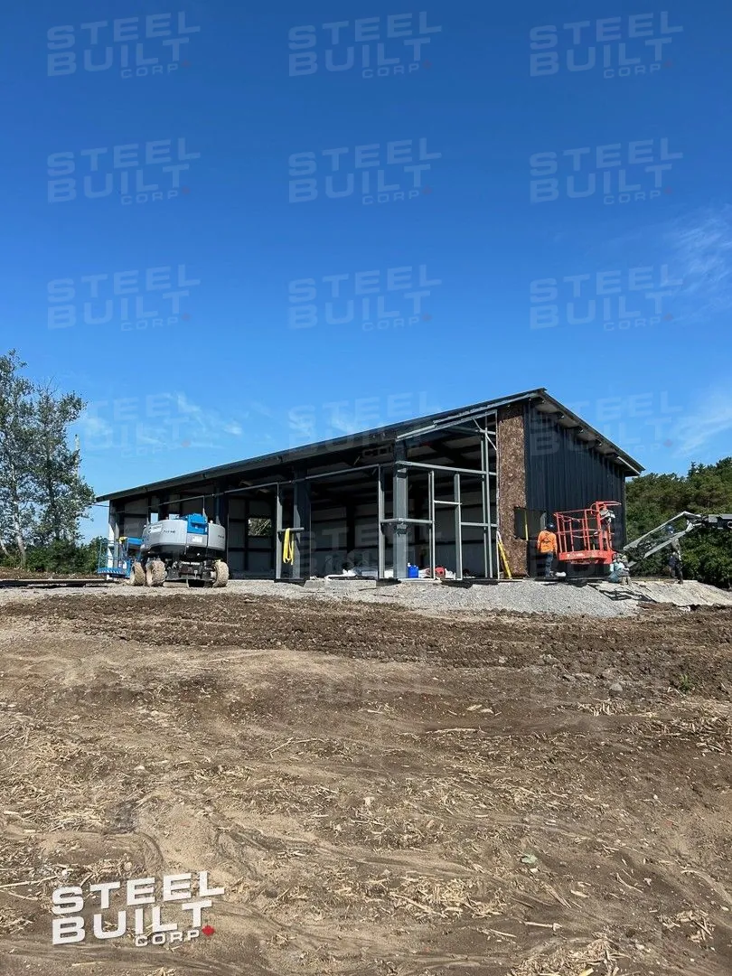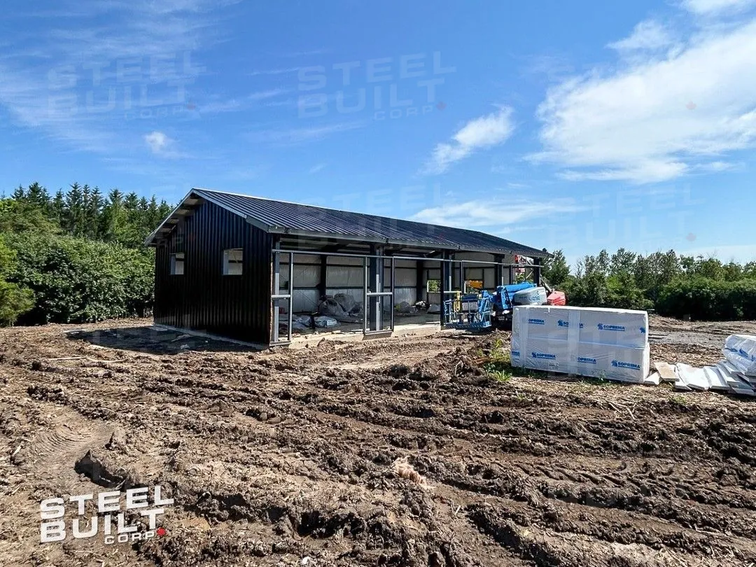 CompletedA 35x65x13 steel garage in Uxbridge, Ontario, with multiple overhead doors for vehicle access and storage, finished in black on black steel.
