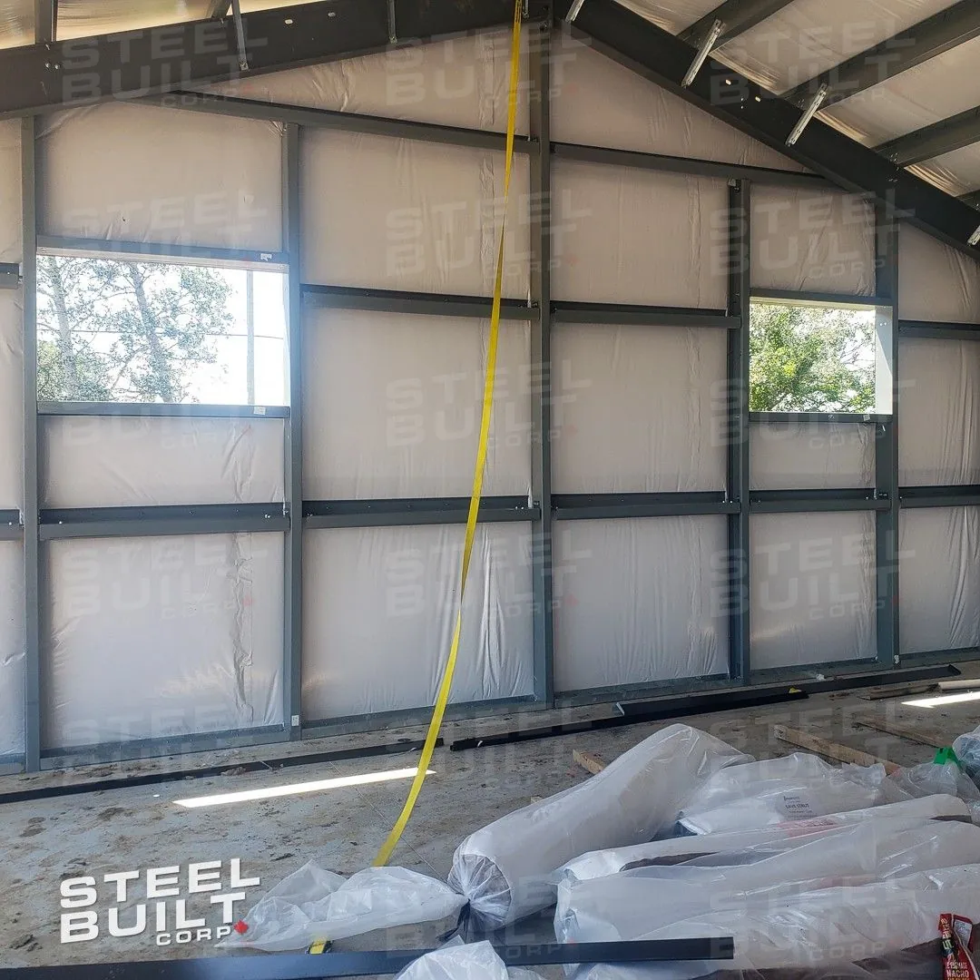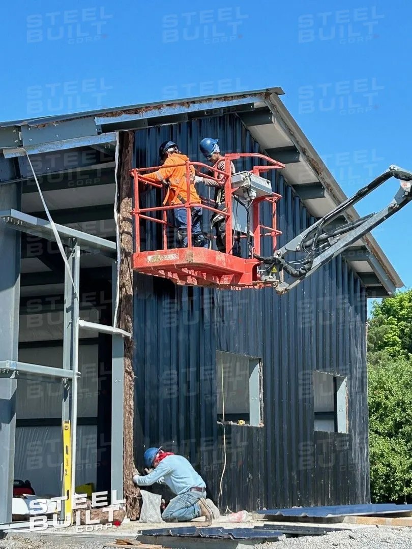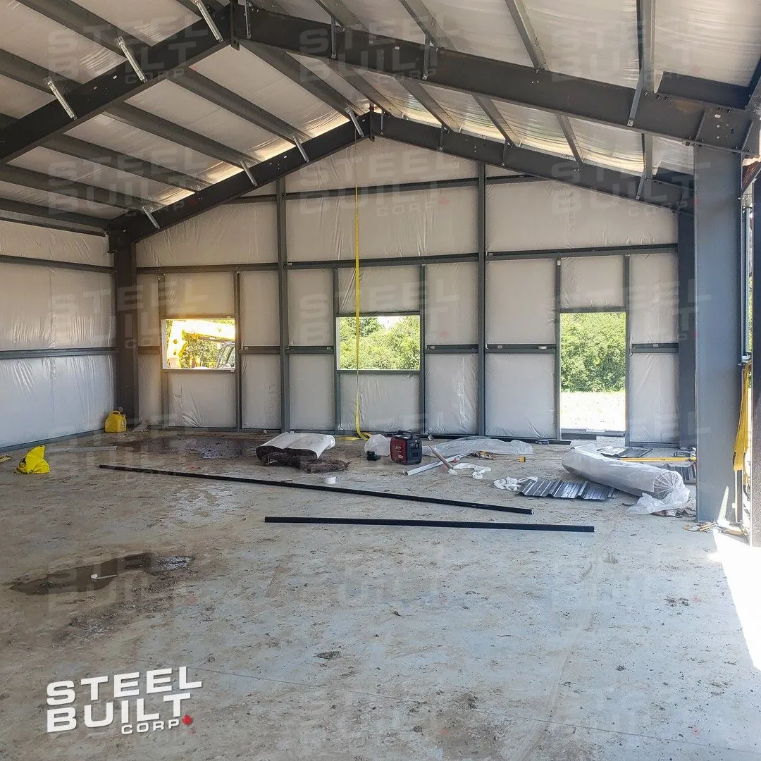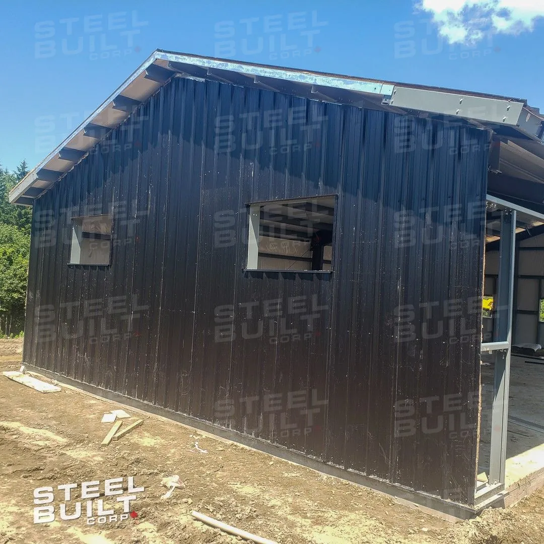 CompletedA 35x65x13 steel garage in Uxbridge, Ontario, with multiple overhead doors for vehicle access and storage, finished in black on black steel.