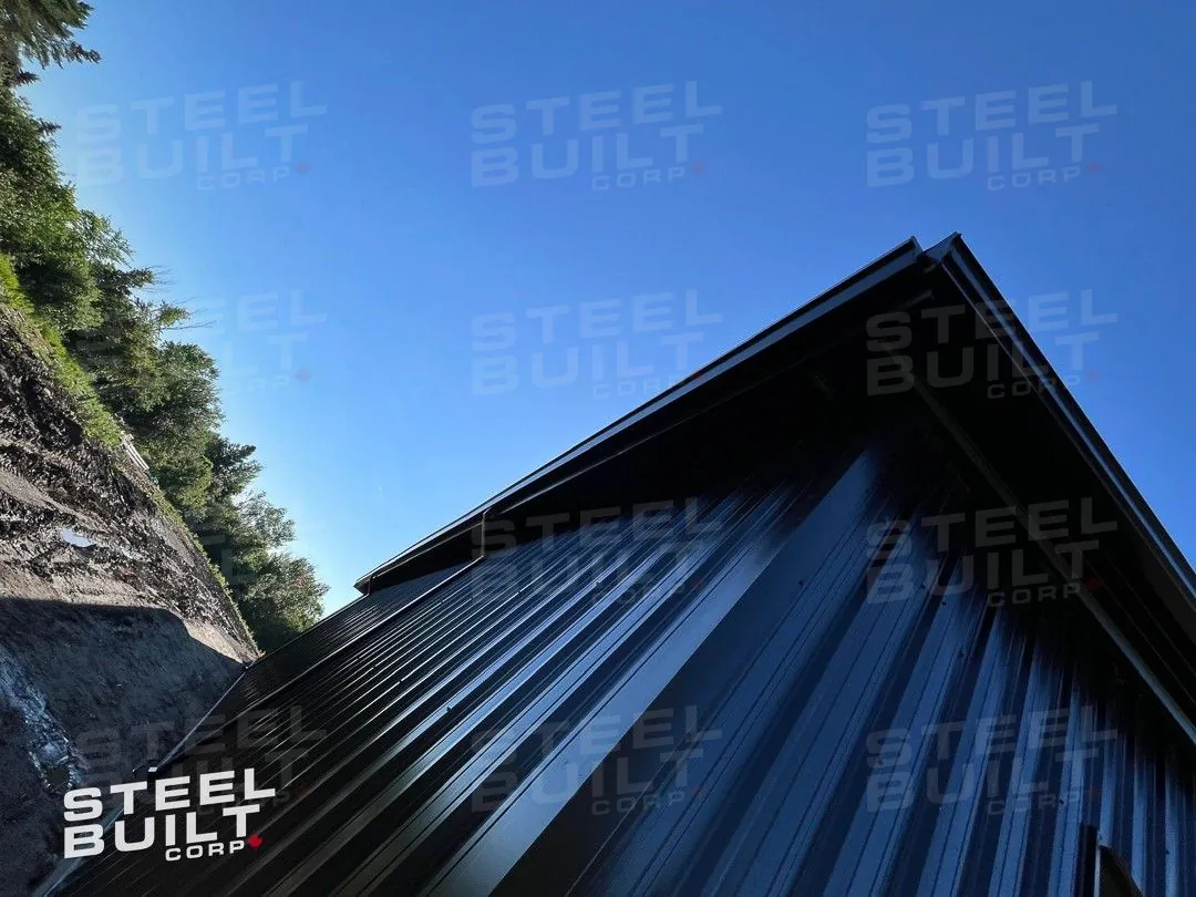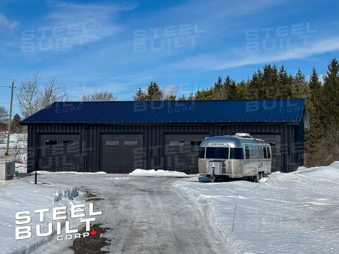 A 35x65x13 steel garage in Uxbridge, Ontario, with multiple overhead doors for vehicle access and storage, finished in black on black steel.