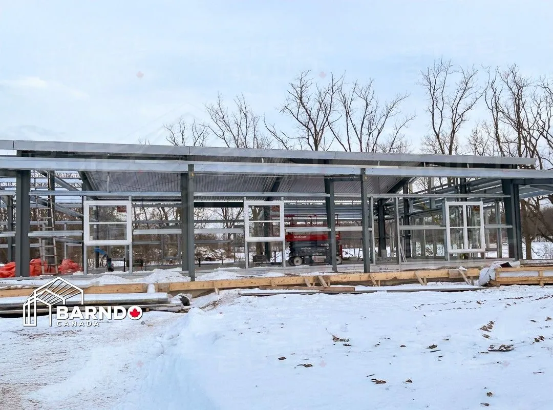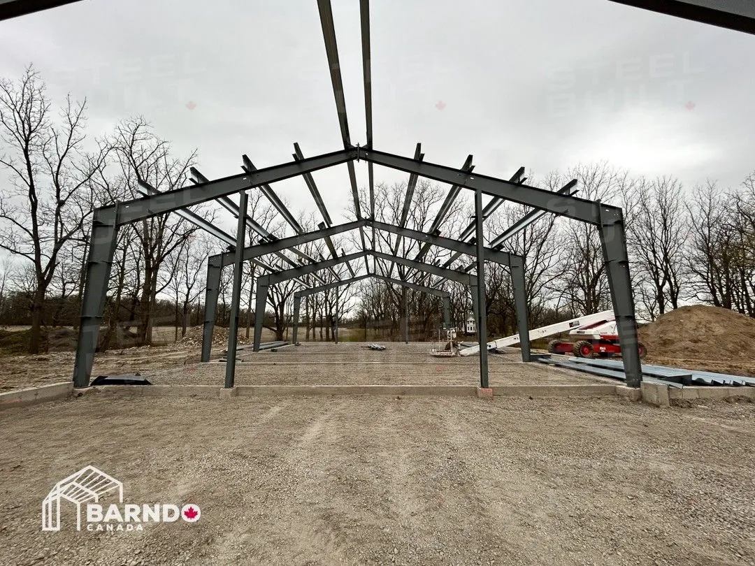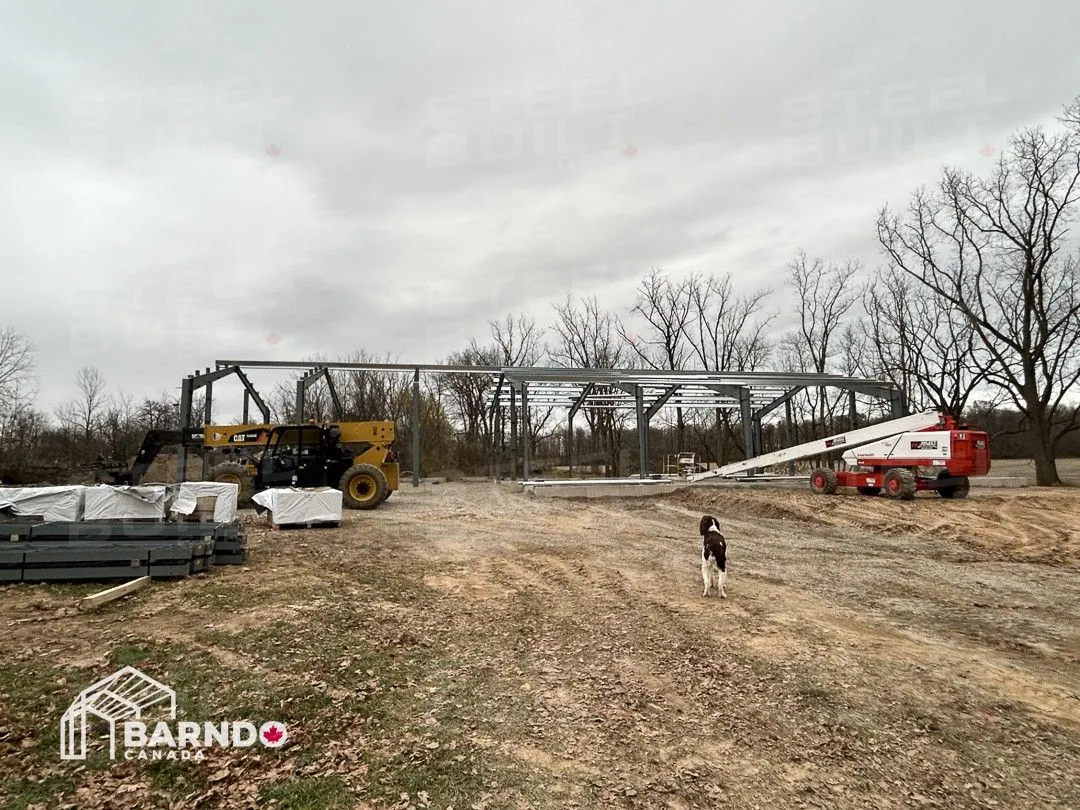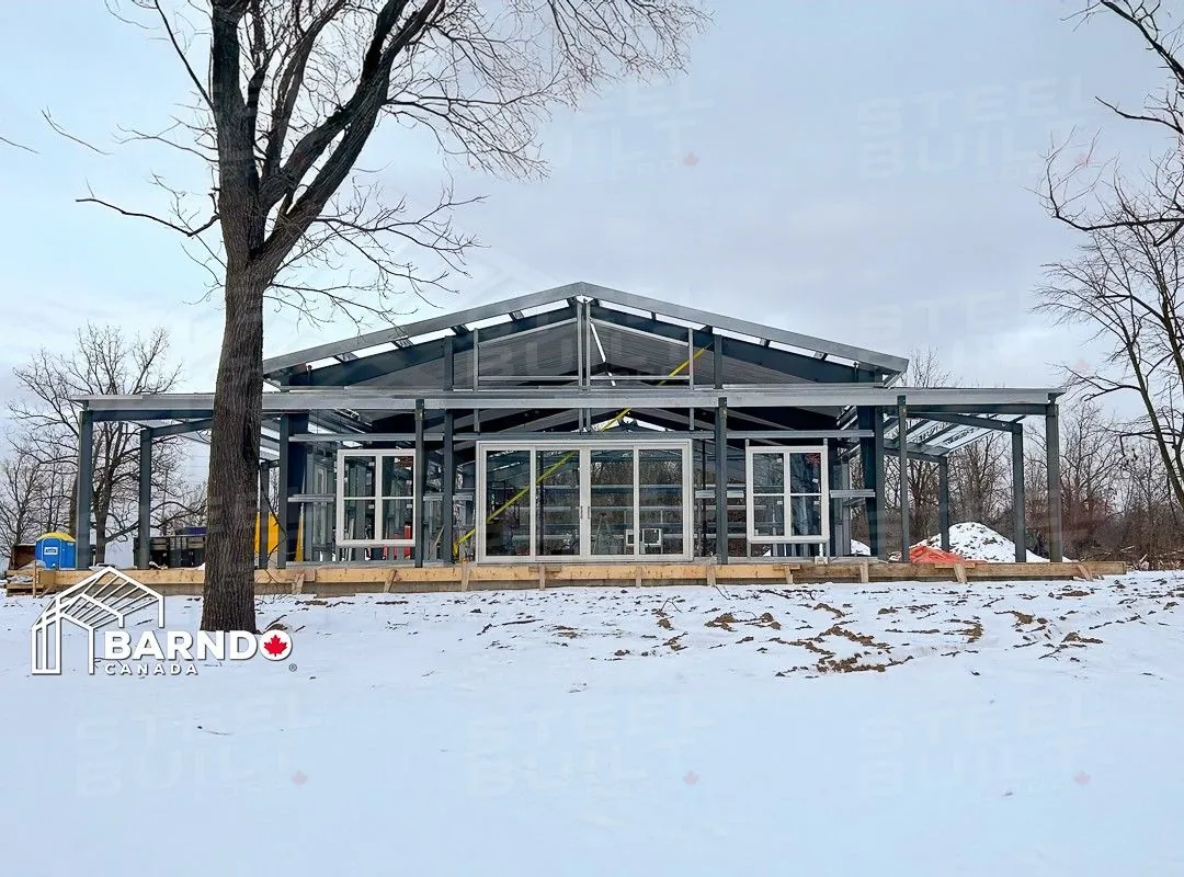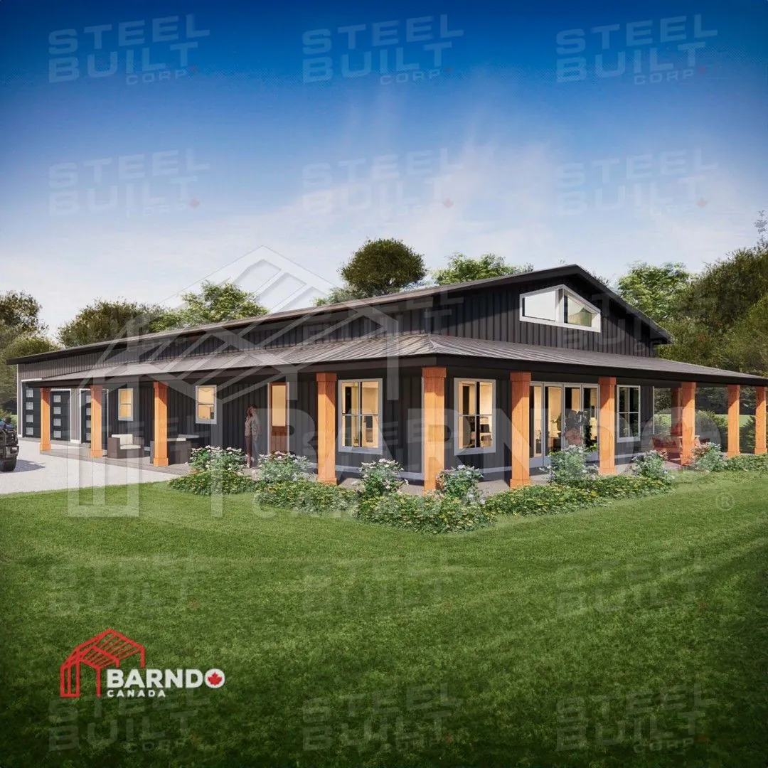 CompletedA 40x100x14 Barndominium in Fort Erie, Ontario, provides a rural escape dream home. This custom steel residence includes a cottage-like cabin with a loft, vaulted ceilings, and a wrap-around porch.