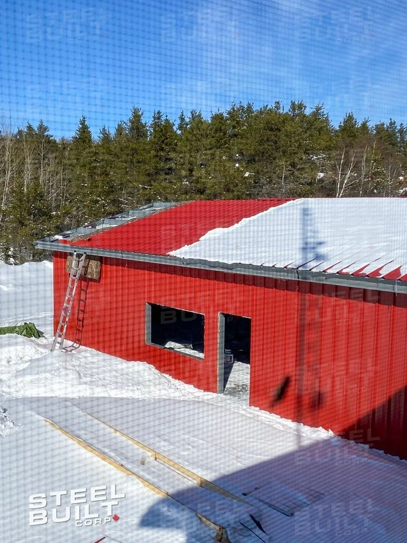 Completed35x50x12 commercial building functioning as a community centre in Cartier, Ontario, featuring red steel with white trim.