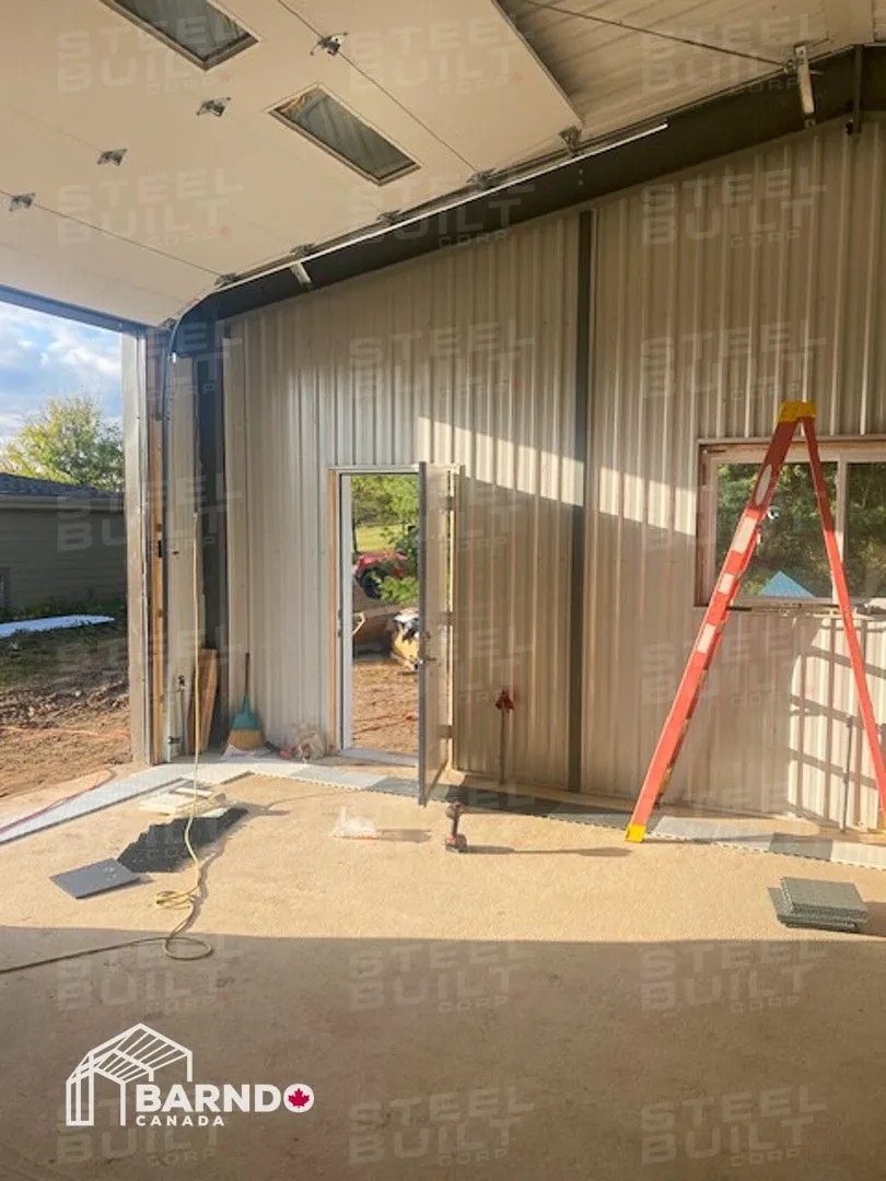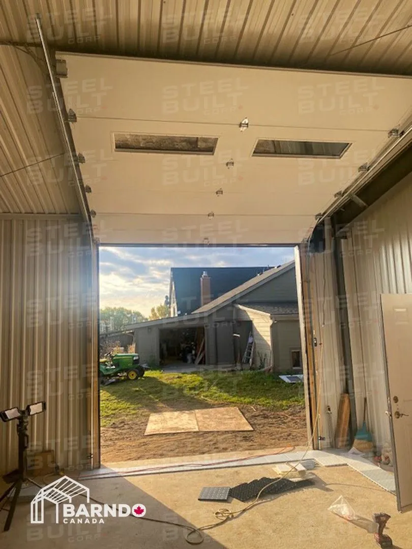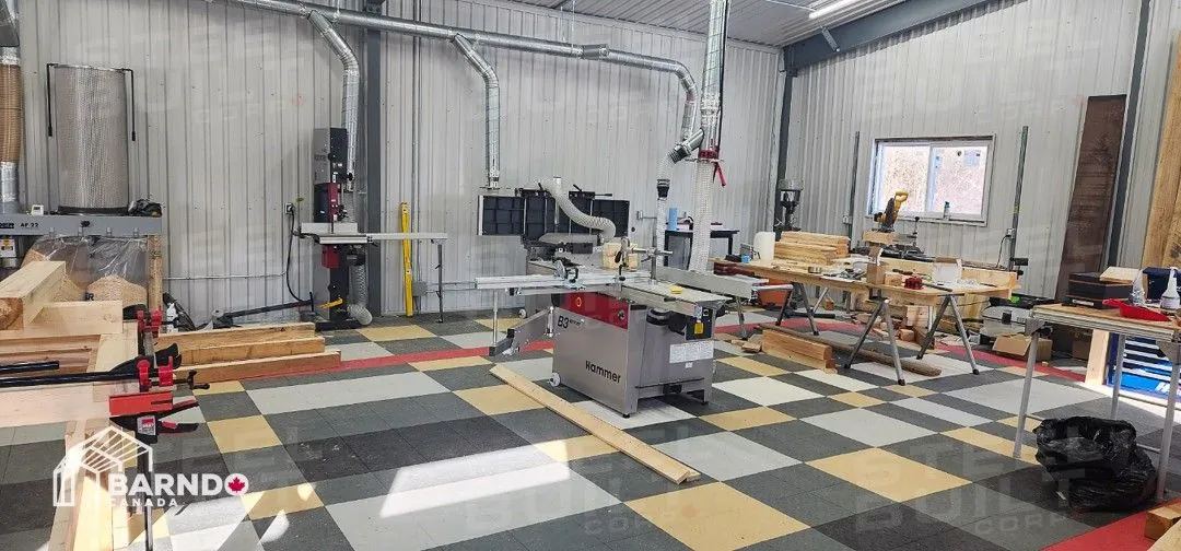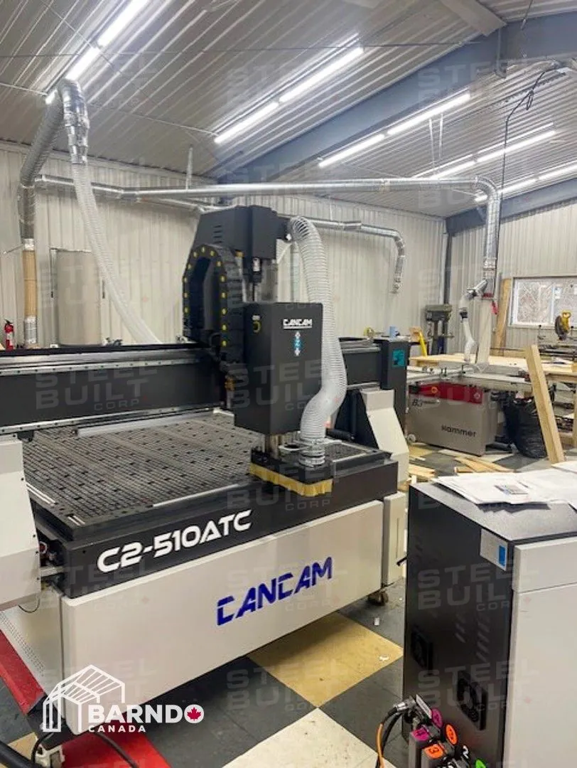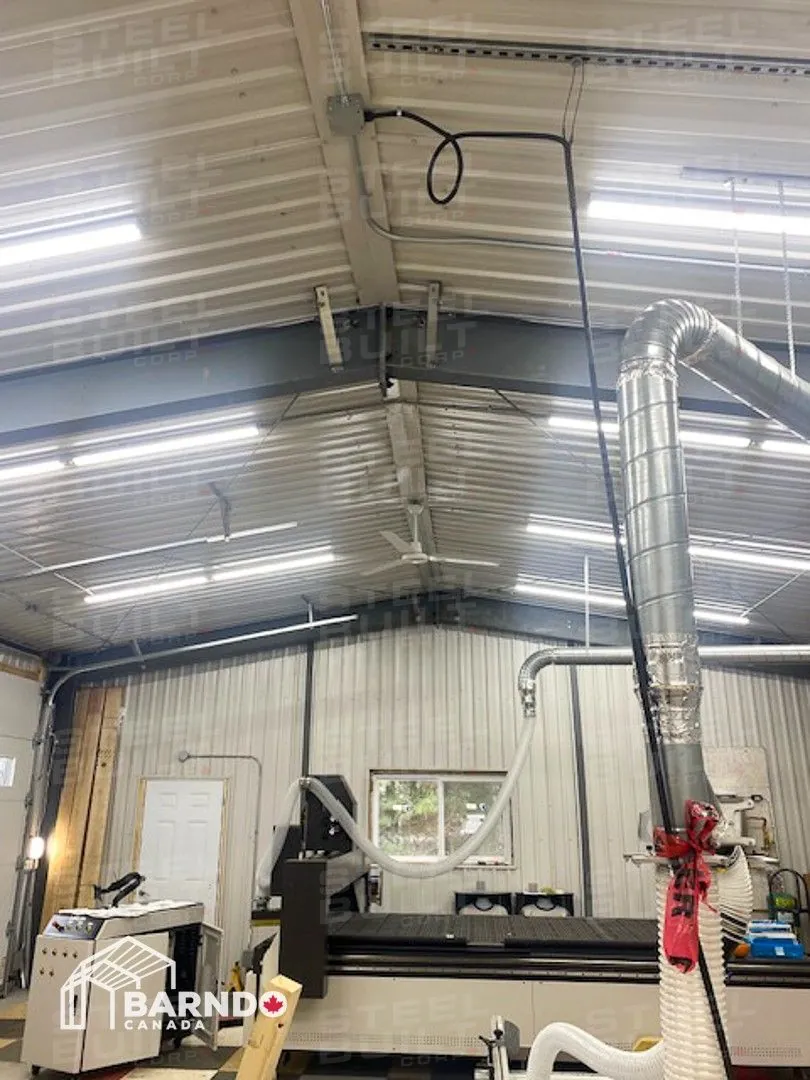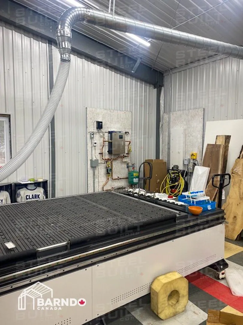 30x40x12 industrial building in Georgetown, Ontario, designed as a woodworking workshop featuring automation equipment, charcoal trim, and a garage overhead door.
