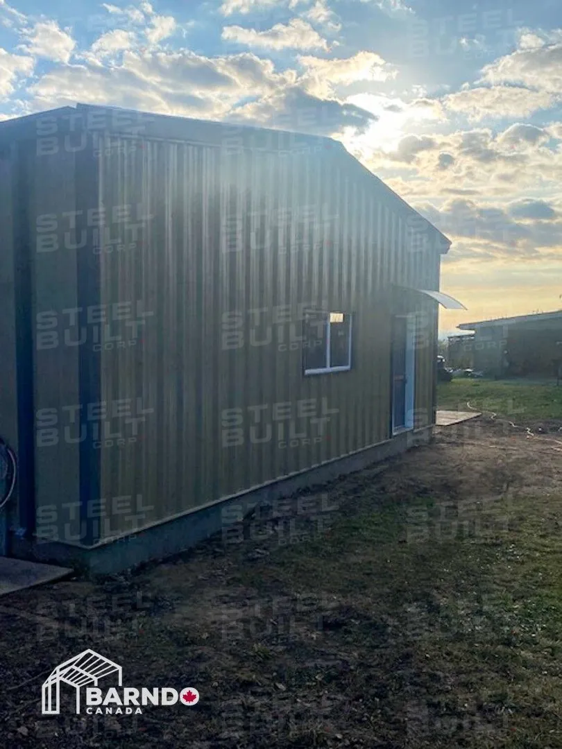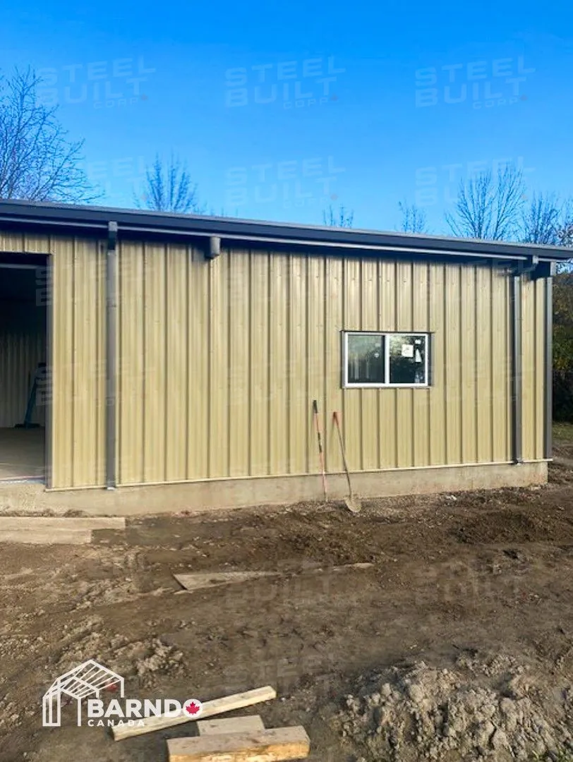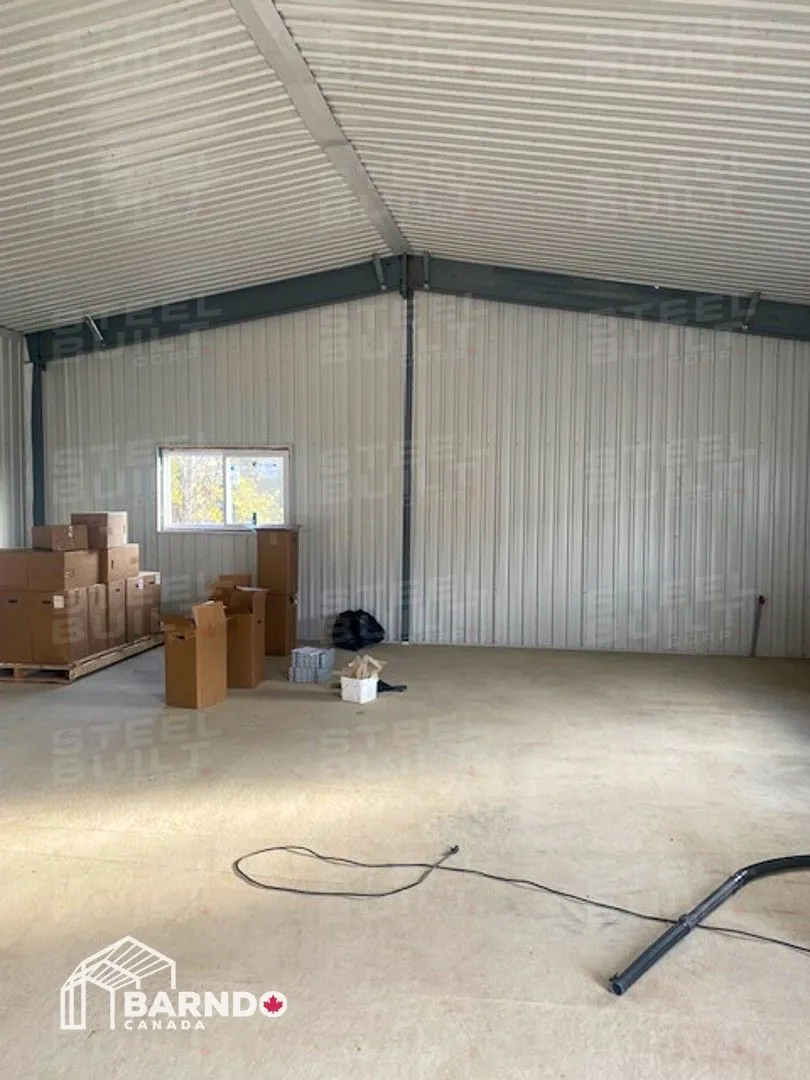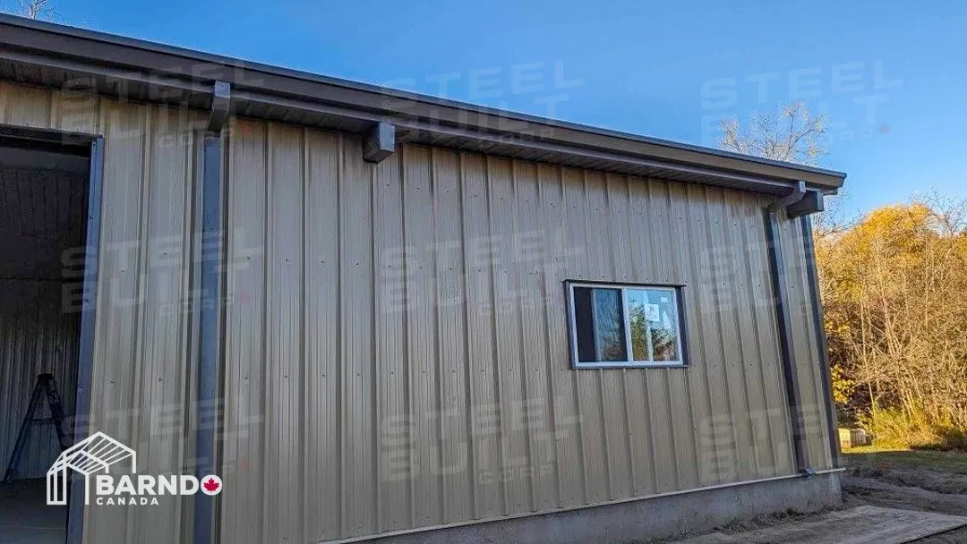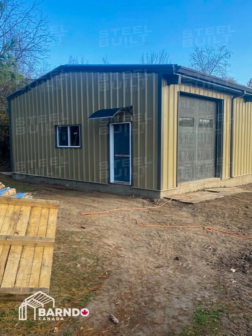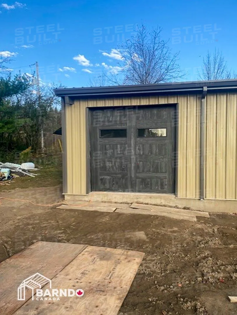 30x40x12 industrial building in Georgetown, Ontario, designed as a woodworking workshop featuring automation equipment, charcoal trim, and a garage overhead door.