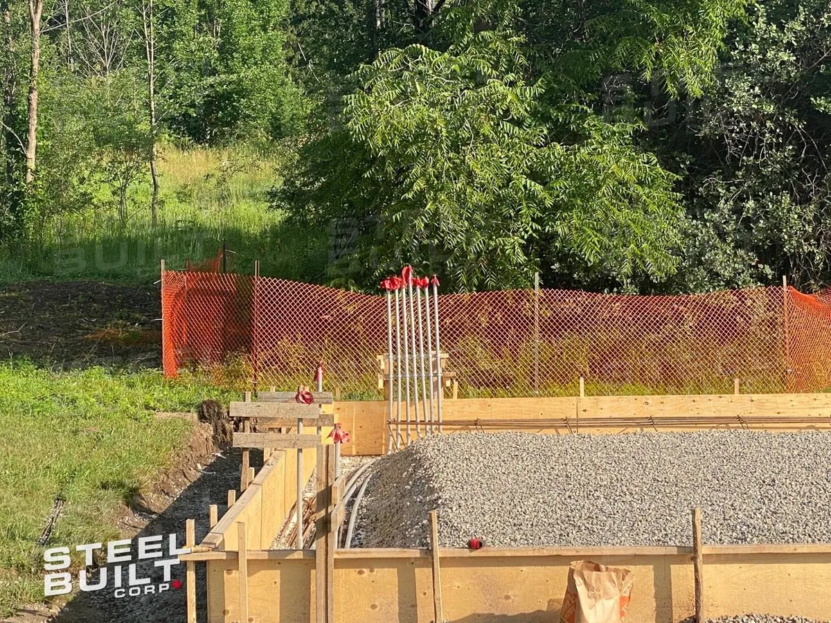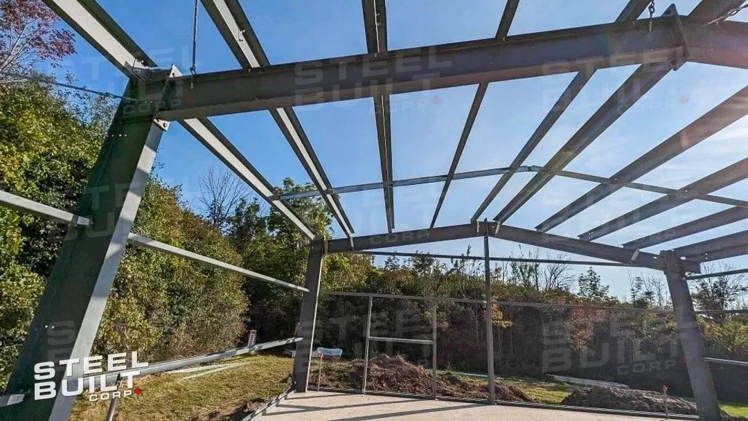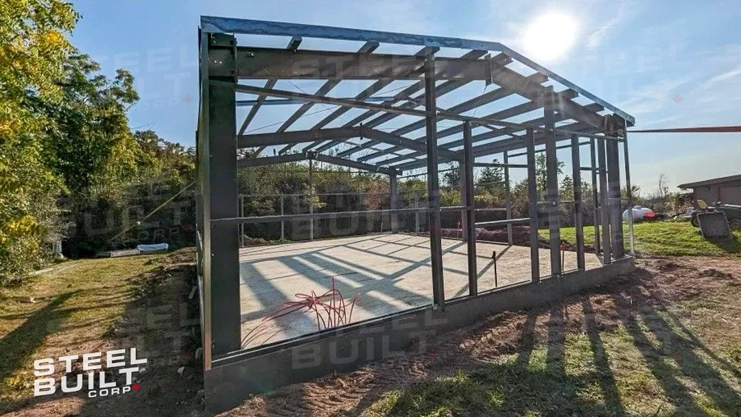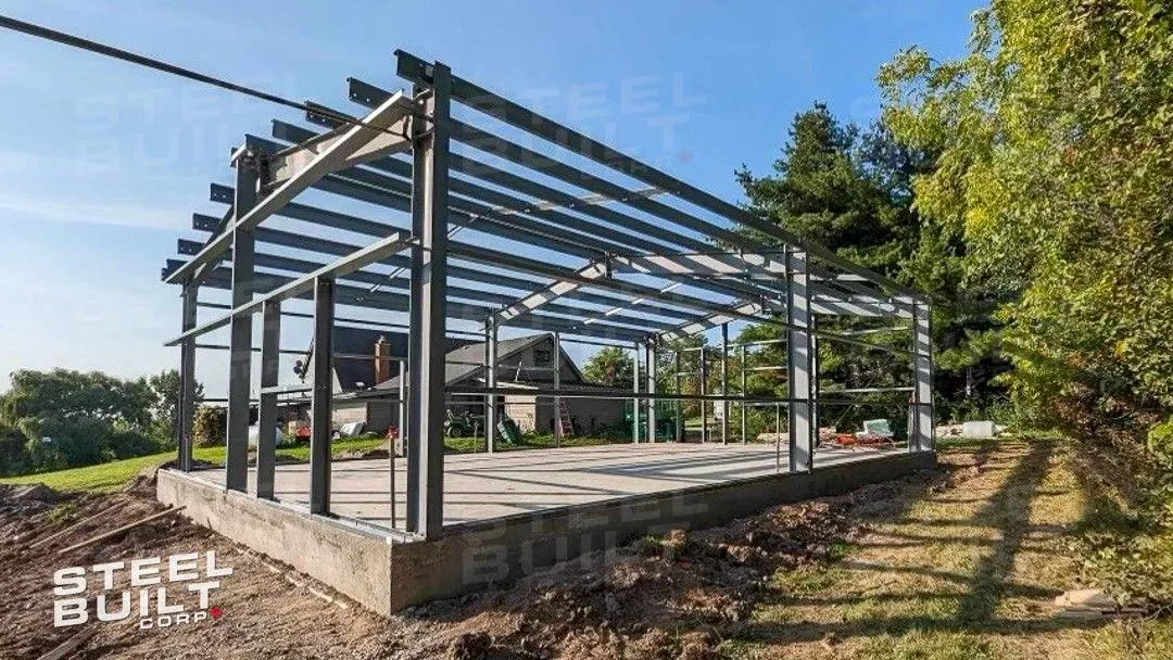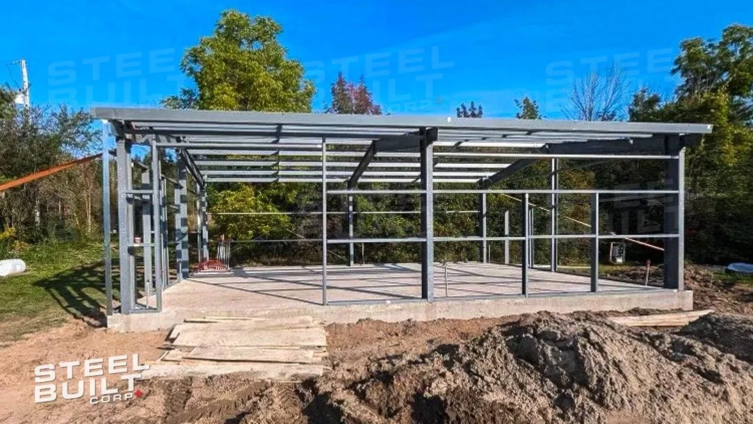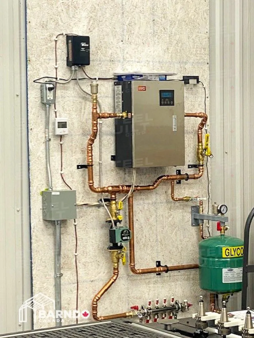 30x40x12 industrial building in Georgetown, Ontario, designed as a woodworking workshop featuring automation equipment, charcoal trim, and a garage overhead door.